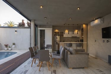 Espacio para el esparcimiento en combinación con un área de alojamiento y terraza en combinación con pileta.